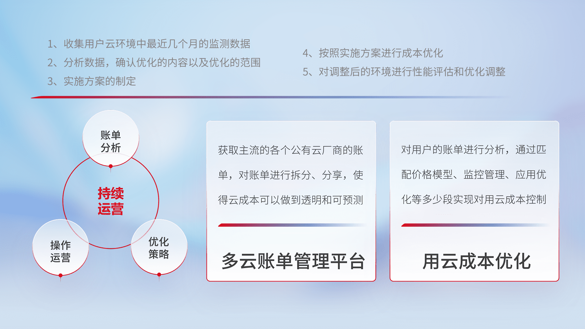 通过多云纳管,,,,以统一的资源数据模型把客户的云资源进行抽象和封装,,进而实现对多云资源的统一操作,,,保障云资源管理的可靠性、、、、稳定性与可用性。。。。量身定制化运维内容,,,,配置、、开发运维、、、补丁管理、、备份、、、监控、、、认证和访问管理、、审计和日常巡检等,,,,保障在用云过程中的可靠度,,稳定度以及高可用率。。